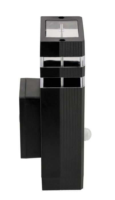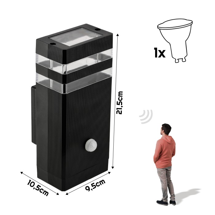 Lampa zewnętrzna ścienna wykonana z wysokiej jakości PC, dostępna w kolorze czarnym mat lub szary mat. Wyposażona w dwa gniazda GU10, przystosowane do żarówek LED o maksymalnej mocy 1 × 10 W . Zasilana napięciem 230 V AC, posiada klasę szczelności IP44, co zapewnia odporność na warunki atmosferyczne. Produkt objęty jest 24-miesięczną gwarancją i posiada certyfikaty CE oraz RoHS.