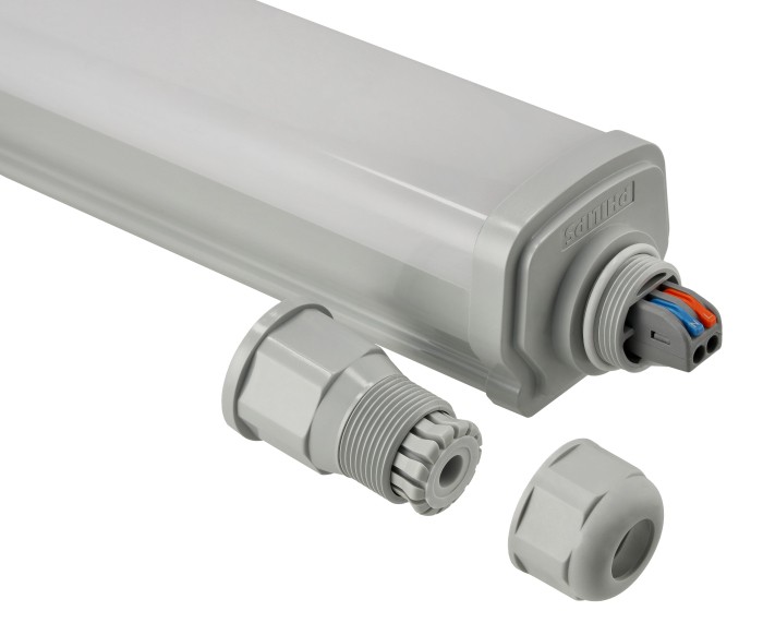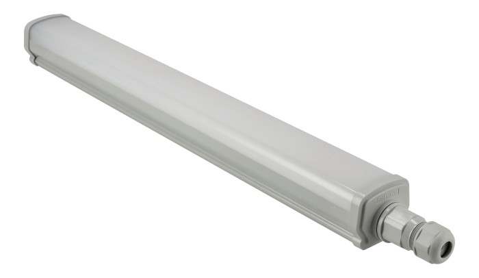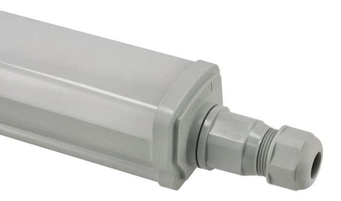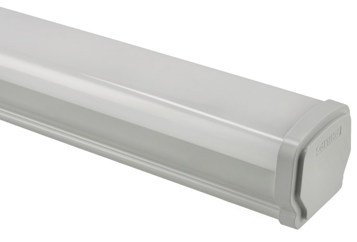 Obudowa wykonana z poliwęglanu w połączeniu ze stalą nierdzewną gwarantuje wysoką odporność mechaniczną i trwałość. Oprawa spełnia normy IP66 (pełna odporność na kurz i strumienie wody) oraz IK08 (ochrona przed uderzeniami), co czyni ją doskonałym wyborem do pracy w trudnych warunkach – zarówno wewnątrz, jak i na zewnątrz budynków.